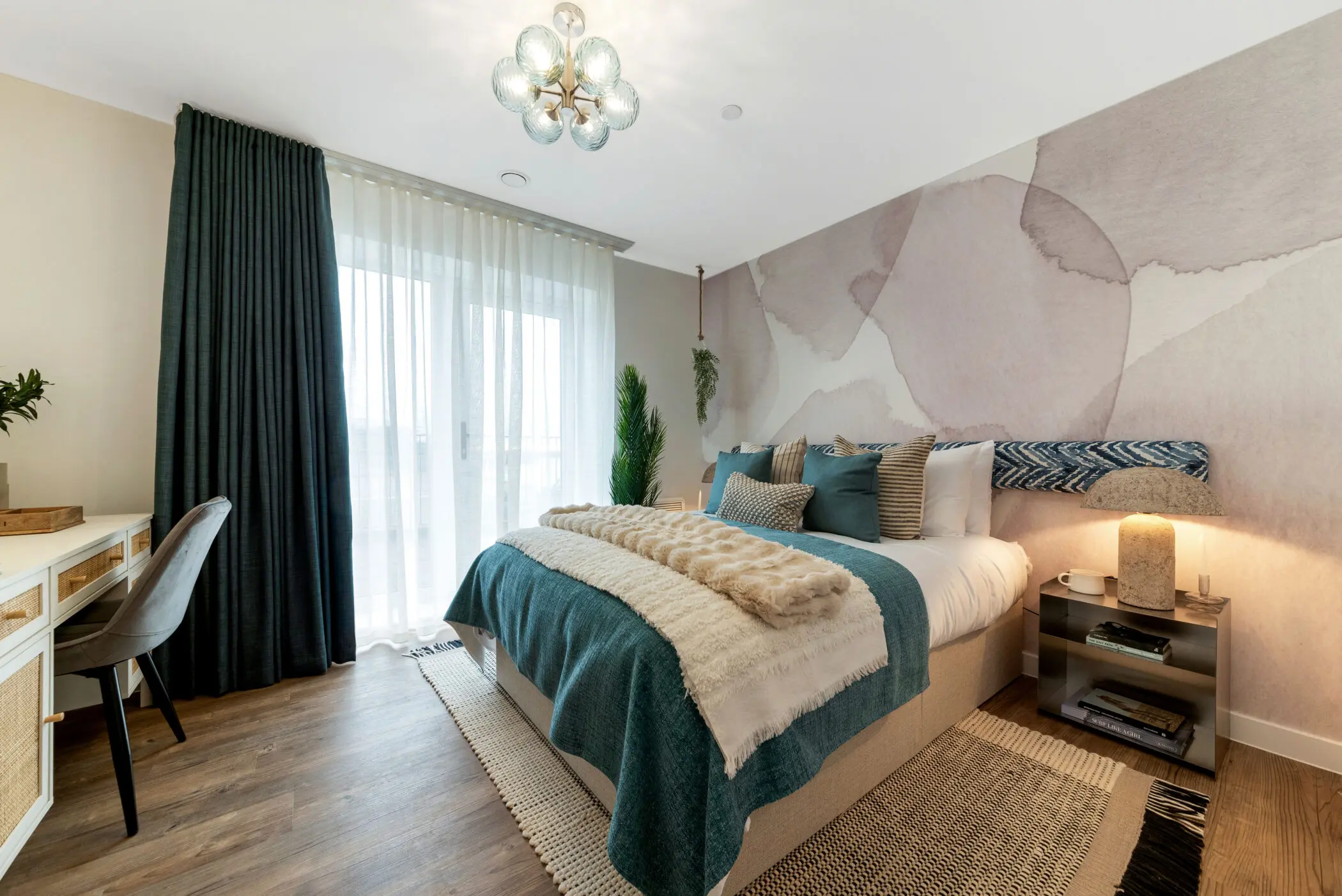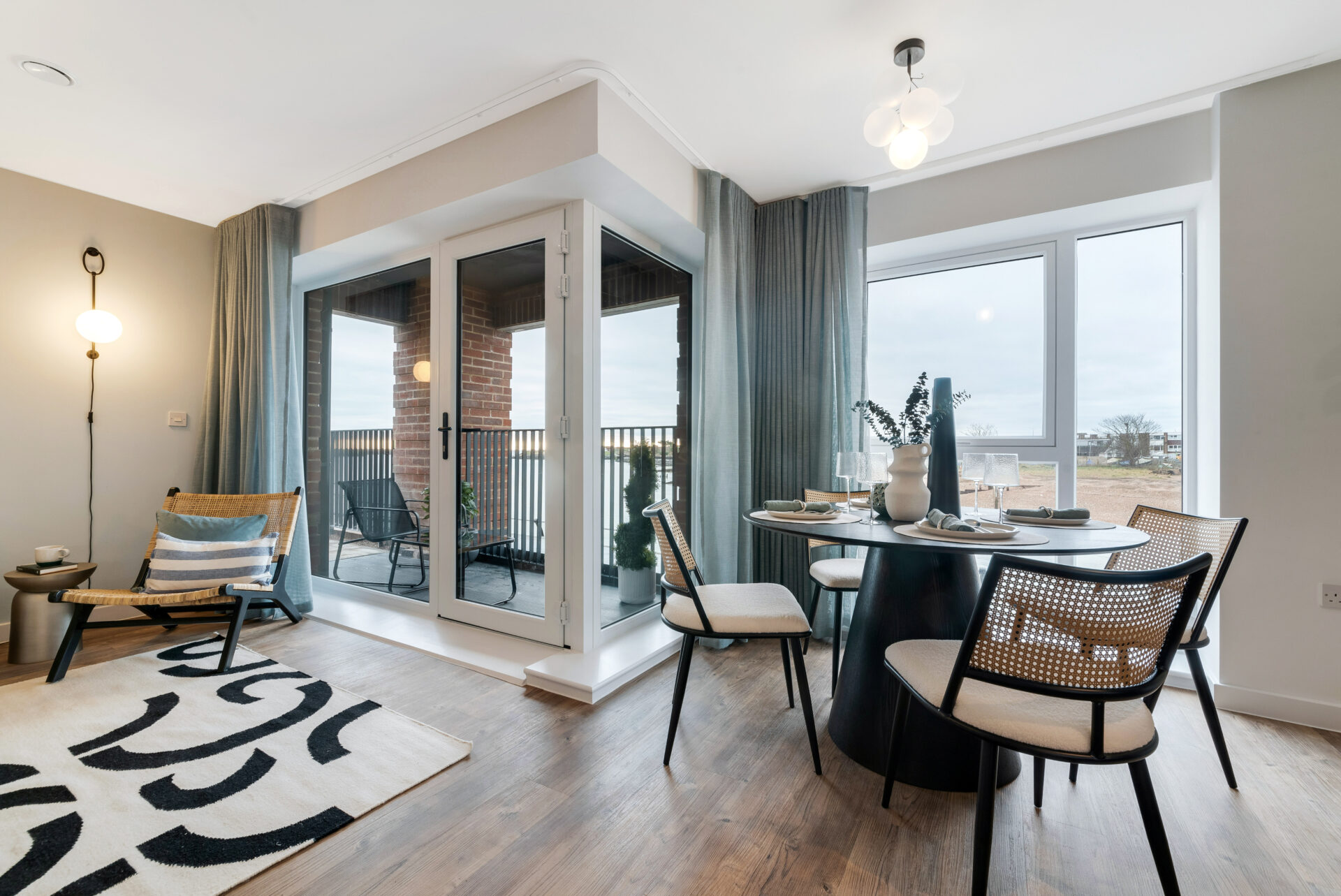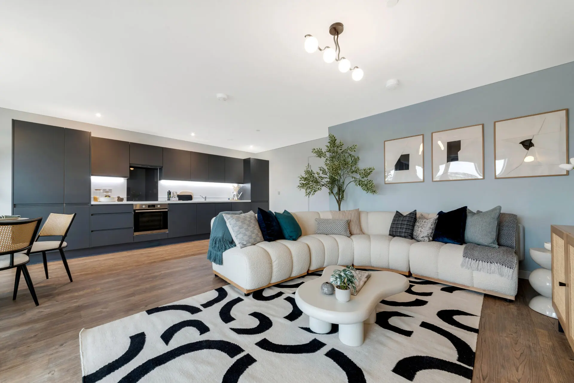 Immerse yourself in the modern, open layout of this two-bedroom apartment. Experience the seamless blend of living and dining areas, featuring a gloss pearl grey kitchen with integrated appliances, quality Amtico vinyl flooring throughout, and ambient downlighting.