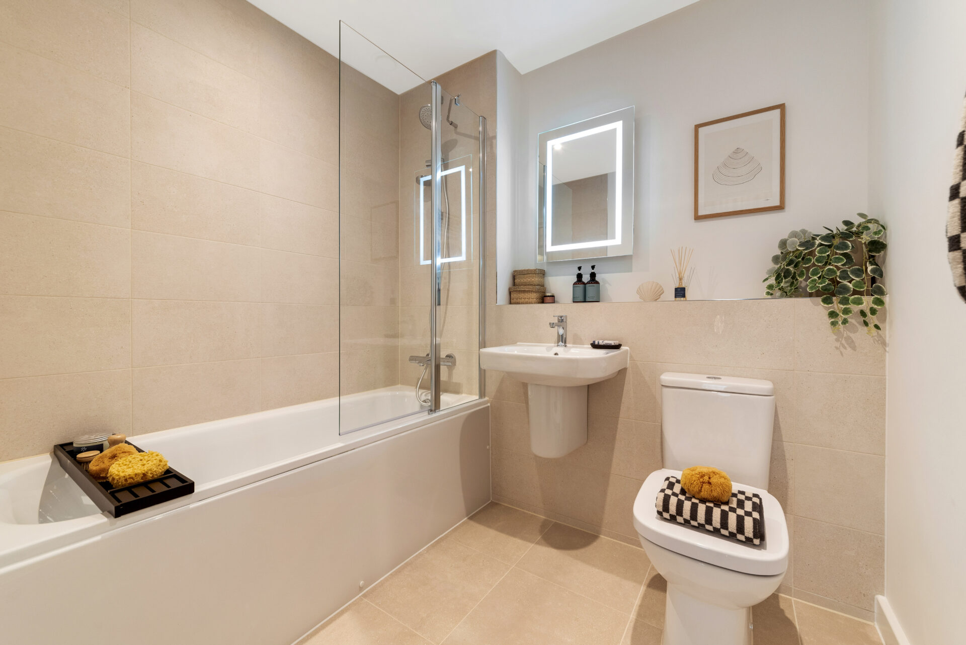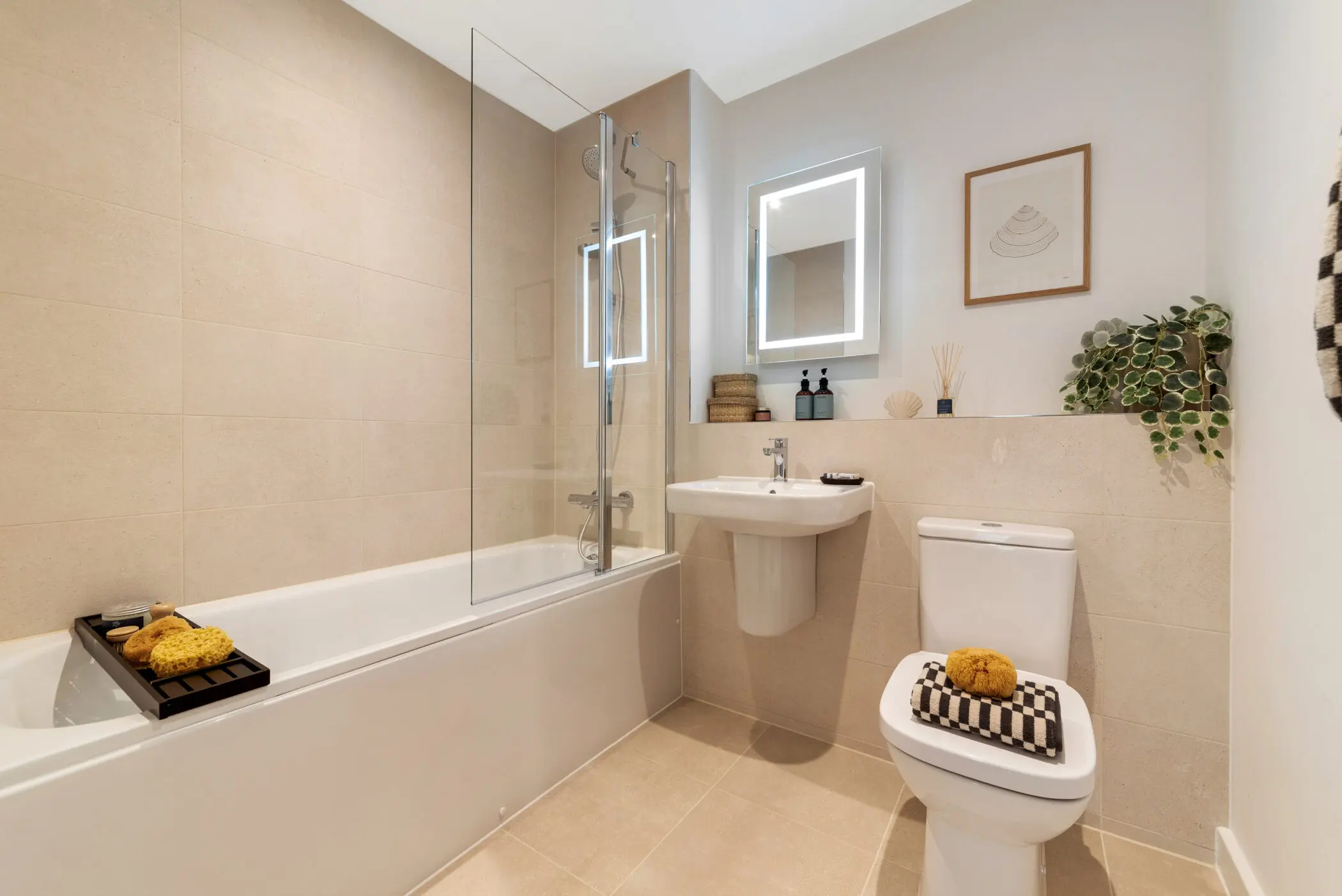 Discover comfort in the double bedrooms, with your own private en-suite or treat yourself to the modern bathroom, featuring grey porcelain tiles, a white suite with a bath, and an overhead fixture with a glass screen. Enhance the experience with an illuminated mirror that adds a touch of luxury.