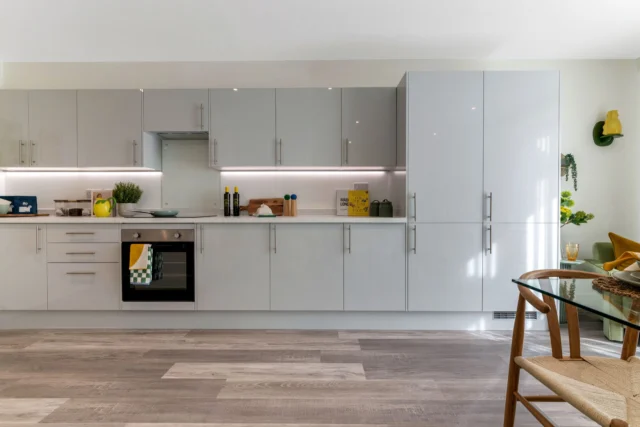 Immerse yourself in the modern, open layout of this second-floor two-bedroom apartment in Century House. Experience the seamless blend of living and dining areas, featuring a matt grey kitchen with integrated appliances, quality vinyl flooring throughout the living and hallway areas, carpet to the bedroom, and subtle ambient downlighting.
