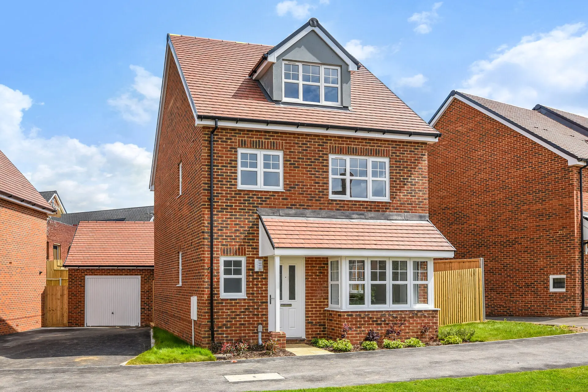An extensive kitchen, dining and family area extends across the rear of the property, with French doors opening into the private turfed garden ideal for summer barbeques and entertaining friends. The ground floor also benefits from a separate lounge with further relaxation space. There is a downstairs cloakroom and handy storage cupboard. Upstairs there are two double bedrooms both with luxury ensuite and fitted wardrobe to the master bedroom. Two further bedrooms on the second floor share the modern family bathroom. This detached home comes with the convenience of a single garage and additional private parking.
